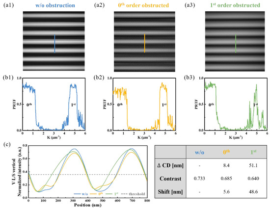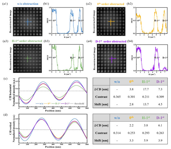 The reconstructed pattern images from the V-L/S diffraction patterns with and without particle obstruction are shown in Figure 8a. The impact of the deformed spatial frequency component of obstructed diffracted light on mask image transfer characteristics was assessed by comparing the normalized intensity profiles at the same position in the reconstructed image, as shown in Figure 8c. The degree of alteration in image transfer characteristics was quantified using a normalized threshold intensity of 0.358, corresponding to the reconstructed image without particle obstruction for the 200 nm CD. CD variation and pattern shift were measured based on the change in pattern size and the displacement of the center position in the pattern formation region exceeding the threshold intensity, respectively. Compared with the data in Figure 8(a1,a2), the results show a 6.5% reduction in image contrast, an 8.4 nm CD variation, and a 5.6 nm pattern shift. Additionally, small peaks were detected in the valley region of the yellow profile shown in Figure 8c. This phenomenon is attributed to the significant intensity loss of the zeroth-order diffracted light obstructed by the particle, reducing its amplitude below that of the ±first-order diffracted light. The ±first-order diffracted light, which formed the L/S pattern with a spatial frequency of 5.05 , interfered more prominently, leading to intensity oscillations that manifest as secondary peaks in the spatial domain [25]. Figure 8(a3) shows a 12.7% reduction in image contrast, a 51.1 nm CD variation, and a 48.6 nm pattern shift caused by the scattering of the first-order diffracted light. These results validate that CD variation was more pronounced compared with Figure 8(a2), as it resulted from the deformation of diffracted light possessing spatial frequency essential for pattern formation in the image plane.