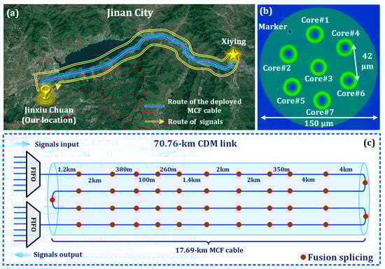 (a) Route of the field-deployed MCF cable; (b) cross-section of the 7-core fiber in MCF cable; (c) the structure of the 17.69 km MCF cable composed of 11 segments of short MCF cables and the schematic diagram of the 70.76 km CDM link.