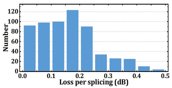 We cascade every four of the eight seven-core fibers in the MCF cable to form two segments of seven-core fiber links as depicted in Figure 1c. Each segment of the seven-core fiber link has a length of 70.76 km (4 × 17.69 km) and 43 multi-core fusion splices. The two segments of 70.76 km seven-core fiber links contain a total of 86 multi-core fusion splices, which is equivalent to 602 single-core fusion splices. We measure the splicing loss of each single-core fusion splice using an optical time-domain reflectometer (OTDR) and a FIFO device at 1550 nm. And the results are shown in Figure 2. It can be observed that the splicing losses of the 602 single-core fusion splices are all less than 0.5 dB, and the splicing losses of over 83.5% of single-core splices are no more than 0.25 dB. However, it should also be acknowledged that the splicing loss of MCF is larger than that of SMF, which is mainly caused by the slight misalignments between the fiber cores of the two cross-sections during the alignment process and the uneven heating of the seven-fiber cores during the arc discharge process. In our field trial, as shown in Figure 1c, a pair of FIFO devices are connected to each segment of the 70.76 km seven-core fiber link to construct two 70.76 km CDM links. We measured the span loss and the total inter-core crosstalk of the two CDM links and the results are shown in Table 2 and Table 3, respectively. The total inter-core crosstalk is defined as the sum of crosstalk from the other six fiber cores to the tested core. We can see that the span loss of each fiber core is no more than 25.3 dB. And the total inter-core crosstalk is lower than −42 dB for each fiber core of the two 70.76 km CDM links.