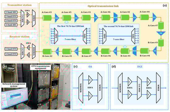 (a) Experimental setup of the real-time long-haul CDM field trail using 400 Gb/s backbone OTN transceivers over deployed MCF cable; (b) the photo of testing site in the Jinxiu Chuan data center; the structures of the (c) OA and (d) DGE.