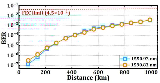 Measured BER values as a function of transmission distance for channel 1550.92 nm and 1590.83 nm.