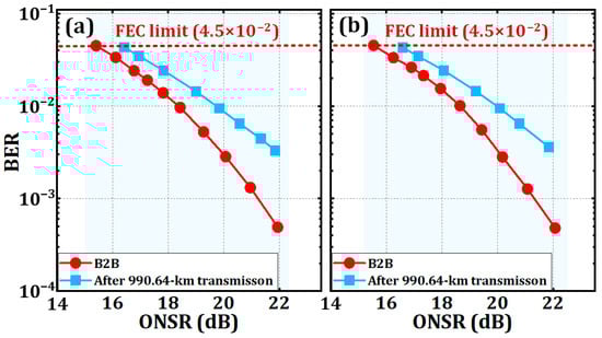 In this section, we introduce the experimental results of our long-haul field trial utilizing a commercial 400 Gb/s backbone OTN system. We first measure the BER values after transmission through each span to evaluate the long-haul transmission capability of the high-speed WDM-CDM transmission system utilizing the setup shown in Figure 3a. As mentioned above, each vacant core is also filled with C + L-band ASE noise to simulate seven-core fully loaded CDM transmission during this measurement process. The total input power of the C-band and L-band signals is approximately 24 dBm and 23 dBm, respectively. The input power of the C-band signal is slightly higher than that of the L-band signal, which is mainly to balance the influence of the SRS effect. The measured results at 1550.92 nm and 1590.83 nm are shown in Figure 4. We can find that the C-band and L-band signals exhibit similar BER performance. And after transmission through 14 spans, the BERs of the test signals are still significantly lower than the SD-FEC limit, which demonstrates that the CDM transmission system using 400 Gb/s backbone OTN transceivers has the capability to transmit over 990.64 km. The BER values under different OSNRs after 990.64 km transmission are further measured and the results at 1550.92 nm and 1590.83 nm are shown in Figure 5a and Figure 5b, respectively. The results under back-to-back (B2B) configuration are also depicted for reference. We can find that the BER–OSNR characteristics of C-band and L-band signals are similar. And under the SD-FEC limit, the corresponding OSNR thresholds are no more than 16.6 dB for both C-band and L-band signals under 990.64 km CDM transmission. Compared to the results under the B2B configuration, the degradation of the OSNR threshold does not exceed 1.1 dB. These results demonstrate that the CDM system utilizing 400 Gb/s backbone OTN transceivers has good noise tolerance and can compensate for the impacts brought by fiber transmission well.