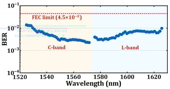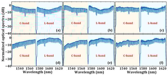 Lastly, we adjust the central wavelength of the OTUs at both transmitter and receiver stations to investigate the BER values at the 80 wavelength channels. The total input power of C-band and L-band signals is also set to 24 dBm and 23 dBm, respectively, by adjusting the EDFAs and C + L-integrated WSSs. The experimental results are shown in Figure 6. It is obvious that after 990.64 km WDM–CDM transmission, the BERs of all 80 wavelength channels are still significantly lower than the SD-FEC limit. And the OSNRs of the 80 wavelength channels are all higher than 19.3 dB, which proves that an OSNR threshold exceeding 2.7 dB is reserved for each wavelength channel. The optical spectra of the transmitted 400 Gb/s 80-wavelength signals at the transmitter, after the first DGE and after the second DGE, are shown in Figure 7a–c, respectively. And the optical spectra of the received signals before the first DGE, before the second DGE, and at the receiver are also depicted in Figure 7d–f, respectively. We can find that the signals at shorter wavelengths are pre-equalized by the WSSs at the transmitter and DGEs, which is mainly to mitigate the effects induced by SRS and the uneven gain spectra of the EDFAs. And the signals at longer wavelengths in the L-band are also pre-emphasized by the WSSs. This is mainly due to the gain of L-band EDFAs for long-wavelength signals being relatively low. Pre-emphasizing the signals at longer wavelengths can compensate for the influence of the EDFAs and thus ensure a relatively flat optical spectrum at the receiver. These results demonstrate the feasibility of real-time 448 Tb/s (400 Gb/s × 80 × 7) transmission over a 990.64 km field-deployed MCF cable. To the best of our knowledge, this is the first real-time long-haul 80-wavelength seven-core WDM–CDM field trial using commercial DP-QPSK 400Gb/s backbone OTN transceivers, and a real-time capacity–distance product of 221.9 Pb/s∙km for MCF cable is field demonstrated.
