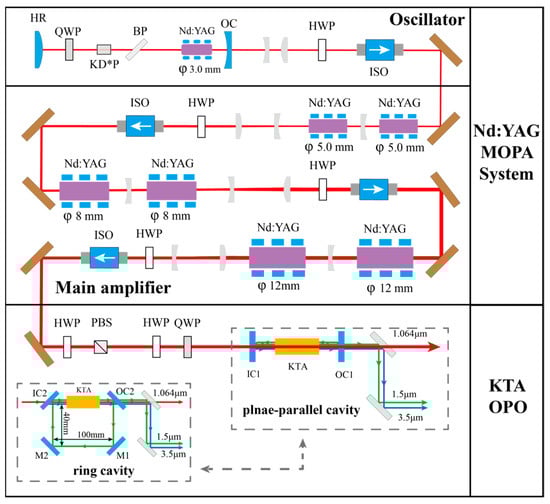 Figure 1 shows the experimental setup of the high-power KTA OPO system. The pump source was a 300 Hz, 1064 nm Nd:YAG MOPA system, consisting of a side-pumped Nd:YAG laser oscillator and three-stage amplifiers. The Nd:YAG crystal, 808 nm laser diode arrays, and heat sink were integrated into a commercial module. All the Nd:YAG modules were side-pumped using 808 nm laser diode arrays, which were operated in a quasi-continuous wave (QCW) mode with a pulse width and PRF of 250 μs and 300 Hz, respectively. For the OPO, a plane-parallel cavity was used to enhance efficiency, while a ring cavity was employed to improve the beam quality.