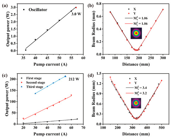 (a) Output power of the oscillator versus the pump current; (b) beam quality of the oscillator at maximum output power; (c) output power of amplifiers versus the pump current; (d) beam quality of the third-stage amplifiers at the maximum output power.