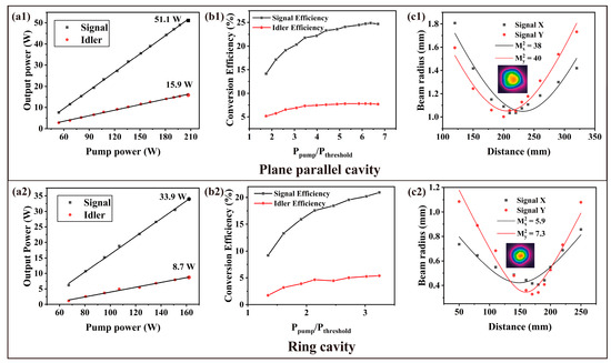 Though plane-parallel resonators can achieve high-power laser output, certain applications require lasers with both high power and beam quality. Thus, a ring resonator with a cavity length of 280 mm was established to balance power and beam quality. The OPO pump threshold increased to 50.0 W. According to the models in [20,21], the pump wave is assumed to comprise a Gaussian spatial intensity distribution. The coupled wave equations can be solved using Runge–Kutta algorithms. It is possible to vary the parameters of the pump beam and the OPO in the numerical model. The calculated pump thresholds of the plane-parallel and ring cavities were 34.5 W and 52.5 W, respectively, which reflects the increased threshold of the ring cavity. The maximum output power dropped to 33.9 W (113 mJ) and 8.7 W (29 mJ) for the signal and idler, respectively, as shown in Figure 3a2, when the pump was 162.0 W, corresponding to a conversion efficiency of 20.9% and 5.4%, as shown in Figure 3b2. The M2 factors of the signal at the maximum output were Mx2 = 5.9 and My2 = 7.3, and the beam quality measurement and corresponding beam profile are shown in Figure 3c2. If the pump increased further, the mirror IC would be damaged, and the output decreased rapidly as the damage area expanded. Although the mirrors used in the two cavities were bought from the same company and customized to meet an identical damage threshold, the IC of the ring cavity was obviously easier to damage; this could occur in the coating process, resulting in a lower damage threshold for the IC of the ring cavity. Limited by damage to the mirror, the maximum conversion efficiency of the ring cavity in the experiment was lower than that of the plane-parallel cavity, but, at the same pump-power-to-threshold ratio, the conversion efficiencies of the two cavities were similar. For example, when the pump power was about three times the threshold, the signal conversion efficiency of both cavities was about 20%. Thus, the ring cavity efficiency could still be improved, provided that the damage problem can be properly addressed.