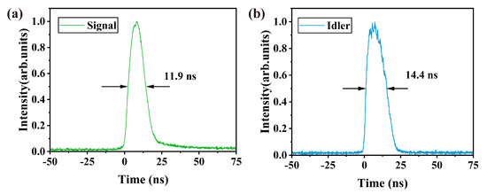 Finally, the pulse shapes were recorded using an indium gallium arsenide detector (Thorlabs PDA10CF-EC, for pump and signal), an MIR detector (MIP-10–100M-F-M4, Vigo, for idler), and an oscilloscope (Tektronix MSO64B), as shown in Figure 5. When the ring cavity OPO operated at the maximum power, the pulse widths of the signal and idler were 11.9 ns and 14.4 ns, respectively. The signal pulse duration was slightly shorter than the pump, while the idler showed a broader pulse width owing to the different detector parameters.