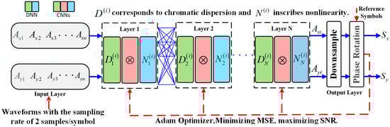 As seen from Figure 2, after handling dispersion and nonlinearity, the waveforms sampled at 2 samples/symbol are down-sampled to 1 sample/symbol. The last stage of these neural networks, as shown in Figure 1, involves a phase rotation with the reference symbols given by the waveform reconstruction module, which eliminates the residual constellation phase offset. During the network training process, the mean square error (MSE) between the symbols output by these neural networks and the reference symbols was used as the loss function, which is defined as , where and are the symbols on the two polarization streams of each neural network’s output, and and are the reference symbols. The effective SNR for symbols is defined as follows: