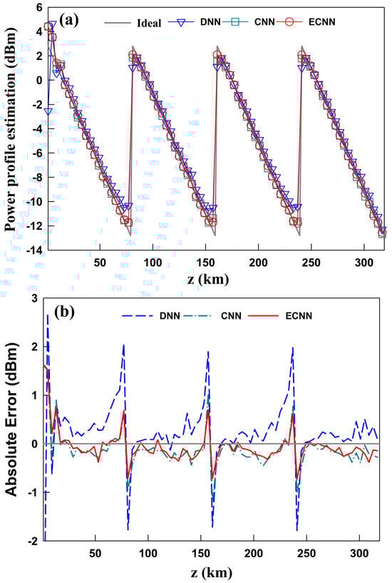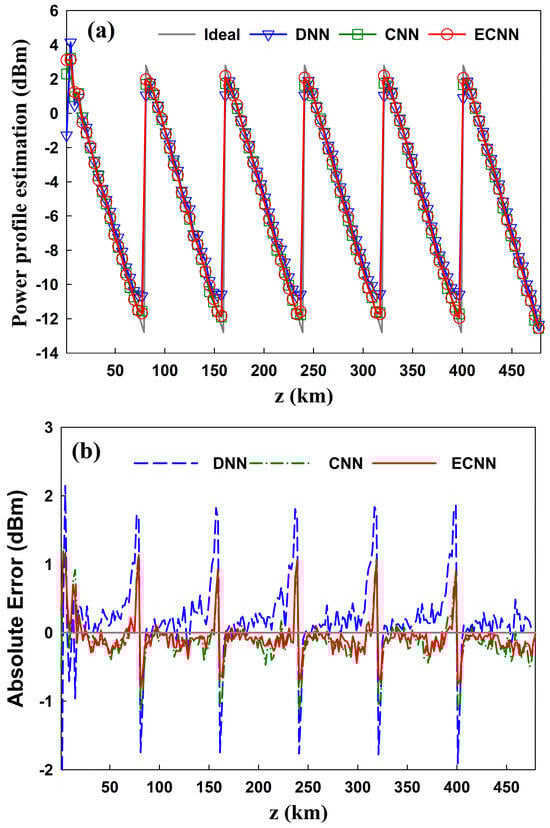 All results are presented in Figure 4a, where the DNN and CNN results are indicated by solid lines with triangular and square symbols, respectively. The ECNN results are indicated by a solid line with circular symbols. As seen from Figure 4a, the PPE accuracy of the DNN deteriorates considerably at the beginning and end of each fiber span. After using the proposed ECNN, the PPE accuracy at these locations is noticeably improved. To more clearly compare the performance of the three neural networks, the absolute error of PPE was computed at each spatial location as , where is the theoretical power profile at position , and is the power profile estimated by the proposed method. The obtained results are shown in Figure 4b. The DNN gives the worst PPE accuracy, followed by the CNN. The ECNN performs the best, giving the highest PPE accuracy.