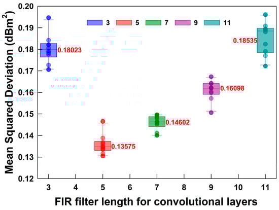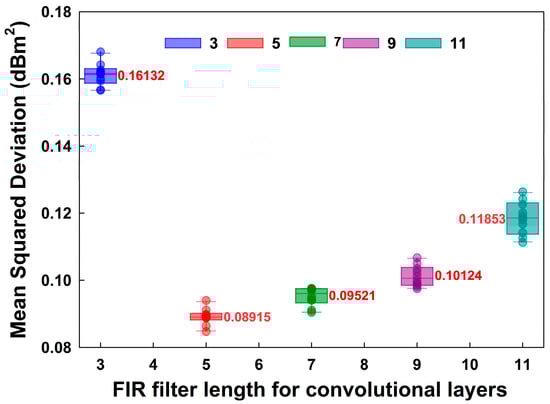 where is the number of spatial positions . For each filter length, the power profile was calculated ten times for this fiber link based on the proposed ECNN. Subsequently, the MSD for each power profile was derived according to Equation (9). All the obtained results are shown in Figure 5, where the box plots are superimposed upon a scatter plot to provide the statistical distribution of these ten measurements. Each point in the figure represents one MSD of a power profile. The average of these ten measurements is also marked in bold red beside the box plot. It can be observed that the ECNN performs the best in terms of PPE accuracy when the filter length is equal to 5, i.e., the optimal length of the FIR filter is equal to 5. Furthermore, the average MSD of PPE produced by the ECNN is the minimum at only 0.13575. The PPE performance of the ECNN degrades when the FIR filter length is less than or greater than 5. Therefore, the FIR filter length of CNNs was selected as 5 in the following experiments unless stated otherwise.