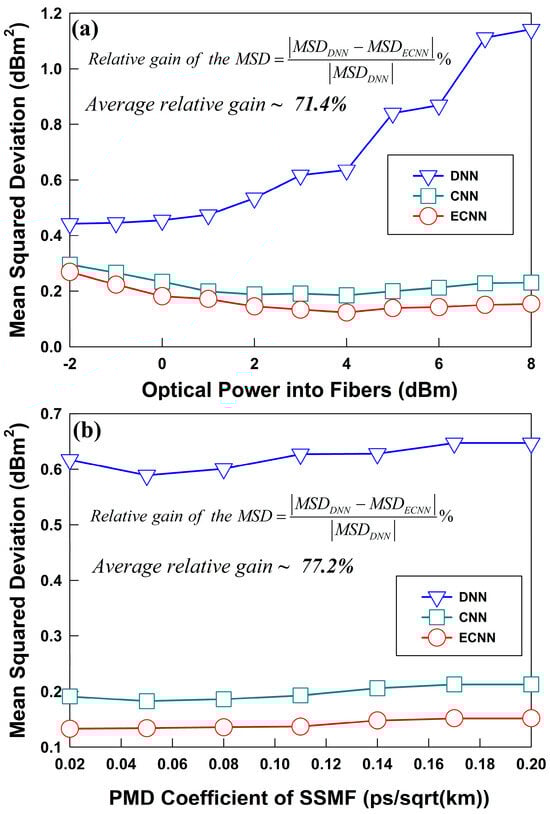 To investigate the influence of the PMD coefficient, the power into the fiber was fixed at 3 dBm, while the PMD coefficient was increased from 0.02 to 0.20 ps/sqrt(km) at intervals of 0.03 ps/sqrt(km). For each PMD coefficient, the MSDs of the PPE output from the three neural networks are shown in Figure 6b. Comparing Figure 6a,b, it can be noted that the PMD coefficient has a considerably smaller impact on the PPE accuracy than the power into the fiber. The MSDs of PPE show only minor variations with respect to the PMD coefficients. At a given PMD coefficient, the ECNN has the highest PPE accuracy, followed by the CNN and the DNN.