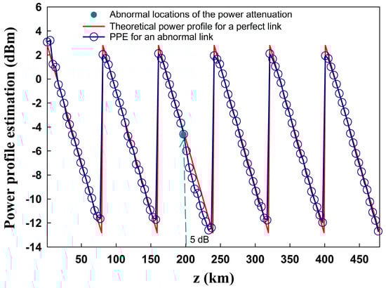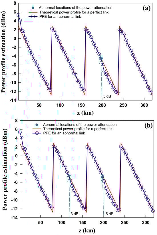 Lastly, the PPE capability of the proposed method was verified for abnormal fiber links. The fiber span number and the length of fiber per span remained unchanged. The power into the fiber was fixed as 3 dBm, and the PMD coefficient was chosen as 0.02 ps/sqrt(km). It was assumed that the EDFA operated in constant output power mode. Two abnormal scenarios were considered, and the PPE performance of the proposed method was verified in these scenarios. The first scenario involved the appearance of a power attenuation anomaly of 5 dB right in the middle of the third fiber span. In the second scenario, two power attenuation anomalies of 3 dB and 5 dB simultaneously occurred in the middle of the second and third fiber spans, respectively. The PPE results of the proposed ECNN corresponding to the two scenarios are shown in Figure 7a,b, respectively. The actual locations where power attenuation anomalies occur are marked with cyan dots in these figures. It can be observed that, at these abnormal locations, the ECNN outputs and the theoretical results significantly deviate, indicating that the proposed method can successfully detect the anomalous power attenuation in both scenarios.