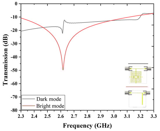 It should be emphasized that in order to effectively distinguish the “bright/dark mode” of periodic structure metamaterial and single unit structure, we need to redefine the bright mode under single unit structure: namely, the resonant mode that was caused by the direct excitation of the feed. For the dark mode, the definition of the dark mode of the periodic single unit is similar to that in the periodic structure metamaterial, that is, the energy can only be obtained through the near-field coupling from the bright mode. Taking the A-EIT metamaterial structure of the classical CW-SRR combination in the periodic structure as an example, observing the S-parameter of an individual dark mode requires directly stimulating the SRR to form an individual dark mode by making the incident magnetic field perpendicular to the entire substrate. It is obvious that since the structure proposed in this work belongs to active devices, the above approach cannot be implemented in a single microstrip feeding structure. To overcome this trouble, we can conduct the upper CW and transmission line between the first and second quadrants, allowing the spiral cross structure to receive power from the waveport to observe the S-parameters of a single dark mode. The difference between this observation method and the dark mode of periodic structures is very obvious, as shown in