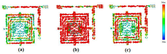 f1. In the spiral cross structure, the current intensity of the first four turns from the outside to the inside is relatively high, while the current intensity of the last two turns is relatively low. We noticed that the current flow direction of