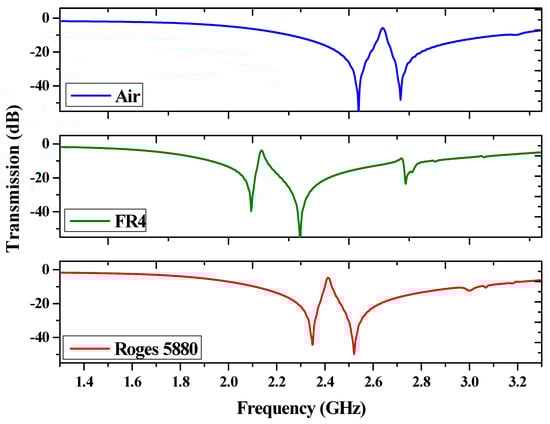 In order to verify the sensing characteristics of the proposed model, we need to investigate the changes in the S-parameter of the sensor when the tested sample is in a loaded and unloaded state. Considering the two most common substrate materials used for manufacturing electronic components in communication engineering, FR4 and Roges 5880 (ε = 2.2), we have simulated the changes in S-parameters of the A-EIT sensor when loaded with the aforementioned material to be tested, as shown in