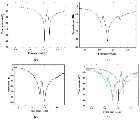 21 tends to be a straight line close to 0 dB, which means that the transmission line cannot directly generate near-field coupling with the spiral cross structure without extending the open circuit branch. This reason is that the distance between the transmission line and the spiral cross structure is too long to generate near-field coupling, and the frequency of the transmission line is also far away from the resonant frequency of the spiral cross structure. The transmission line and open circuit branch are considered as bright mode together, and then the open circuit branch transmits energy to the spiral cross structure through near-field coupling, while the spiral cross structure is considered as dark mode. Bright and dark modes with the same frequencies can usually excite the A-EIT phenomenon. By comparing the results of the S-parameters mentioned above with the EIT theory of periodic structures, we can conclude that the “bright-dark mode” theory is also effective in single-unit microstrip feeding structures.