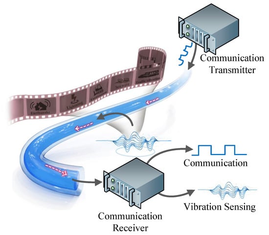 The rapid advancement of fiber-optic communication systems has revolutionized modern telecommunication networks, offering unparalleled data transmission speed and reliability [1,2]. As these systems continue to expand in scale and complexity, the need for real-time monitoring of physical environmental conditions, such as vibrations, is becoming increasingly critical [3,4,5,6]. This necessity has driven the development of integrated sensing and communication (ISAC) technologies in fiber optics, which aim to seamlessly combine the functionalities of communication and sensing within fiber infrastructure, as shown in Figure 1. By leveraging existing communication systems for environmental monitoring, ISAC can enhance the efficiency of network operation and maintenance and reduce costs [3,4].