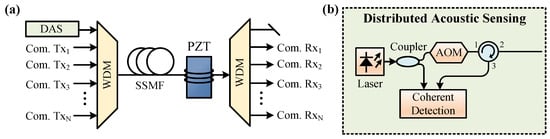 Conventional integrated communication and back-scattering-based sensing mainly utilize wavelength division multiplexing (WDM) technology to input sensing signals into the standard single-mode fiber (SSMF) used for communication [37,38]. As shown in Figure 2a, connecting a distributed acoustic sensing (DAS) system to one channel of the WDM system as a sensing channel enables vibration sensing based on back-scattering. The structure of the DAS system is illustrated in Figure 2b. A coupler divides the output light from the NLL into two parts: one part serves as the sensing probe, and the other part acts as the local oscillator for sensing. The probe light undergoes modulation through an acousto-optic modulator (AOM) to generate pulsed signal, which is then routed via a circulator to the sensing channel. Vibrations in the sensing channel induce Rayleigh back-scattering signal, which is coherently detected. The received signal is processed based on power and phase information to achieve distributed vibration sensing. Since the sensing channel and communication channel do not interfere with each other, the insertion of the sensing system has almost no impact on the communication system.