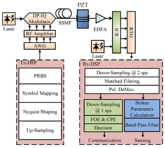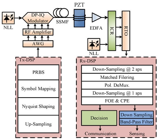 The experimental setup for demonstrating the integrated phase-based sensing and communication scheme is shown in Figure 12b and the experimental parameters are shown in Table 2. At the transmitter side, the pseudo-random binary sequence is mapped using dual-polarization 16-QAM symbols. Subsequently, the Nyquist shaping is performed on the signal using a root-raised-cosine (RRC) filter with a roll-off factor of 0.1. Then, the signal is subjected DSCM and up-sampled to the AWG sampling rate. Finally, the FPT at 10 GHz is inserted into X polarization and the FPT at −10 GHz is inserted into Y polarization. The center frequencies of the four subcarriers are set to −15 GHz, −5 GHz, 5 GHz, and 15 GHz, respectively, and the subcarrier intervals are set to 2 GHz. The symbol rate is set to 4 × 8 GBaud/s. An ECL with a 3 dB linewidth of 100 kHz is modulated by a dual-polarization in-phase and quadrature (DP-IQ) modulator driven by the AWG. After transmission through the SSMF, a variable optical attenuator (VOA) is used to adjust the received optical power (ROP) and an EDFA is used to compensate the loss of the fiber. At the receiver side, the signal and another ECL are coherently received by an ICR and the detected signals are captured by an RTO with a sampling rate of 64 GSa/s. Then, the received signals are processed by the ISAC scheme. For vibration sensing, vibration induced by a PZT is applied to the link.