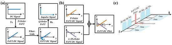 (a) Generation and energy centralization property of FrFT-DC signal. (b) Generation of FrFT-DC pilot at Tx. (c) Frame structure of DSCM signal with FrFT-DC pilot at Tx [25,26].