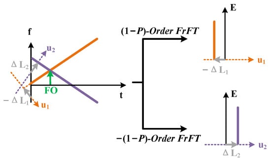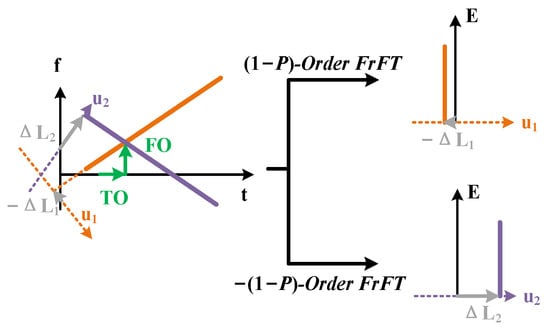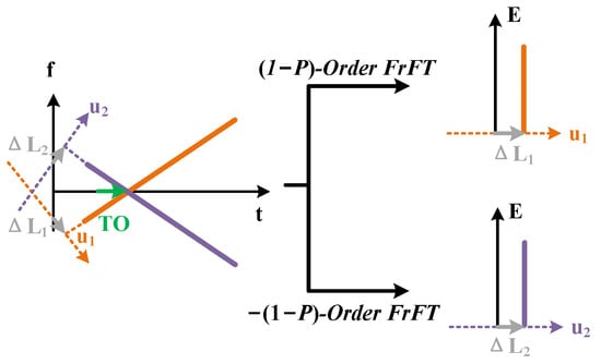 The FOE based on the FrFT-DC pilot is shown in Figure 6. When there is an FO between the transmitter and receiver lasers, the FrFT-DC pilot will shift along the frequency axis, with the shift corresponding to the FO. At the receiver side, the FrFT-DC pilot is firstly down-converted to base-band, and then a low-pass filter is used to extract the FrFT-DC pilot. The FrFT-DC pilot is processed with -th (-order and -th ()-order FrFTs, resulting in pulse peaks whose horizontal axis coordinates correspond to and , respectively. Considering the geometric relationship, the FO is determined using the two coordinates, as shown in Equation (11) [25,26]:
