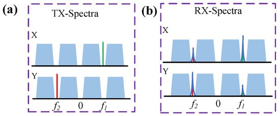 The signal spectra at the transmitter side are shown in Figure 10a. In the X polarization direction at frequency , an FPT is inserted, and in the Y polarization direction at frequency , an FPT is also inserted. Due to the symmetry of the center frequencies of subcarriers in the frequency domain, it follows that .