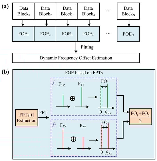 The FPT-based dynamic FOE process is illustrated in Figure 11a. After extracting the FPTs, data blocks are formed on the FPTs, followed by FPT-based FOE for each block. The FPT-based FOE process is shown in Figure 11b. The fast Fourier transform (FFT) is firstly performed on the extracted FPTs and then spectra of both polarizations are combined at and , respectively, to mitigate the effects of polarization fading. The frequency offsets at and are determined by calculating the peak frequency shifts in their respective spectra, and the average of these two frequency offsets is taken as the frequency offset for this data block. The vibration-induced phase and laser-induced frequency offset phases additively affect the overall phase, resulting in additional estimated frequency offset fluctuations. In theory, the phase variations caused by vibrations result in a rapidly changing frequency offset component, whereas laser-induced frequency offset drift changes more slowly. Hence, polynomial fitting is utilized to mitigate the estimated frequency offset fluctuations induced by vibrations [34].