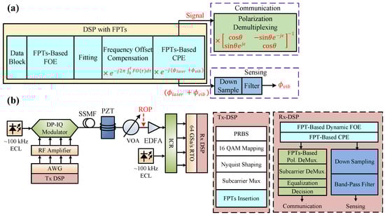 An integrated communication and phase-based vibration sensing scheme is shown in Figure 12a. Firstly, dynamic FOE and CPE based on FPTs are performed on the received signal. For telecommunication signals, the FPTs are utilized for depolarization demultiplexing. Regarding the carrier phase, considering that vibration frequencies are generally below MHz, the phase is firstly down-sampled to the MHz level to reduce computational complexity. Subsequently, filters such as band-pass filters are applied to extract the vibration-induced phase [34].