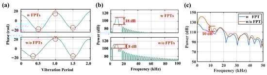 In the aforementioned experimental system, forward-phase-based vibration sensing using FPTs is employed. As a comparison, the scheme described in [19] is used to process the subcarrier with a central frequency of −15 GHz. A 10 kHz sine vibration is applied to the link, and the vibration-induced phases are extracted using the same band-pass filter (BPF) with a passband from 5 kHz to 15 kHz. The extracted vibration-induced phases are shown in Figure 13a. The spectra of the vibration-induced phases are presented in Figure 13b, demonstrating that the FPTs-based scheme achieves a 10 dB sensing signal-to-noise improvement. Background noise is tested with both schemes without applying vibration and without BPF, as shown in Figure 13c. Compared to the forward-phase-based sensing using the communication data, forward-phase-based sensing using the FPTs achieves 10 dB sensing background noise suppression at 10 kHz [34].
