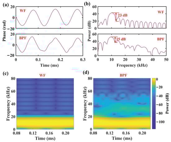 By following the aforementioned procedure, WF-based vibration-induced phase extraction is achieved. Unlike traditional BPF-based methods, this approach eliminates the need for vibration frequency information and demonstrates higher adaptability. Under 10 kHz sinusoidal vibration conditions, the vibration-induced phase was extracted using both WF and a BPF with a passband from 5 kHz to 50 kHz. The results are shown in Figure 14a. The corresponding frequency spectra and short-time Fourier transform (STFT) spectra of the extracted phases are displayed in Figure 14b–d. It can be observed that the scheme based on WF achieved an 8 dB improvement in sensing signal-to-noise ratio, and the phase extraction based on WF exhibits more stable vibration frequency sensing and reduced sensing background noise power in the STFT spectra [35].