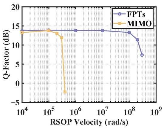 Q-factors under different RSOP velocities using both FPTs and MIMO for SOP tracking.