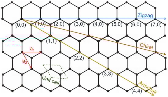 Any SWCNT of chiral indices can be thought of as being a hollow cylinder prepared by rolling a graphene sheet along the specific chiral vector given by , where and represent the graphene lattice vectors. and serve as translation vectors. A scheme of rolling a graphene sheet to obtain different types of SWCNTs is presented in Figure 1. The radius and chiral angle of any SWCNT can be calculated as [28,29,30]