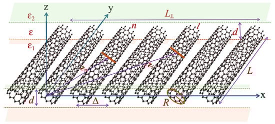The literature is rich in the study of mechanical [31], electronic [32], optical [33,34,35], and plasmonic [36,37] behaviors of a single SWCNT. This paper extends our work to the thin and ultrathin films of homogeneous SWCNTs, which are oriented along the y-axis in periodic alignment. A schematic diagram of the theoretical model considered in this study is presented in Figure 2. Each SWCNT presented in the figure was plotted using Nanotube Modeler Software, Version 1.8 [38,39], which is a program to generate -coordinates and plot interactive graphics for capped and uncapped nanotubes and nanocones for a chosen chirality, tube length, and bond length. The SWCNT array is immersed in a dielectric medium of thickness d and constant effective relative permittivity . The substrate and superstate have relative permittivities of and , which are relatively much smaller in value than . Each SWCNT has a radius R and length L. The center-to-center inter-tube distance satisfies with the minimum ideal distance being the sum of the radii of the two closest tubes. determines the dispersiveness of SWCNTs in the film, with a larger signifying a highly dispersed SWCNT film. denotes the SWCNT film width. The SWCNTs have uniform electronic charge distribution throughout the surface of the tube.
