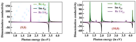 where is an infinitesimal frequency parameter. The dynamical conductivity of an SWCNT is estimated using the well-known method of band structure calculations [45,47]. The conducting behavior of SWCNTs significantly varies with the chirality and divisibility of the difference between chiral indices by 3. For example, (9,0) SWCNT is metallic, while (10,0) SWCNT is a semiconducting one. The exciton–plasmon spectrum for the conductivity of metallic SWCNT significantly differs from the semiconducting one, as shown in Figure 3.