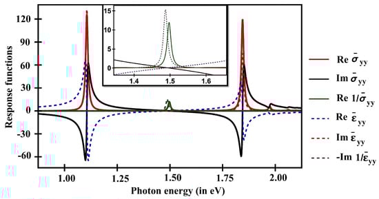 For illustrative purposes, the dimensionless response functions, namely longitudinal conductivities and longitudinal dielectric functions for an (11,0) SWCNT, are presented in Figure 4. gives us the surface plasmon’s density of states, which is nonzero when the imaginary part of vanishes and the real part of also approaches zero. The quantity is nonzero only if the is zero and approaches zero at the same time.