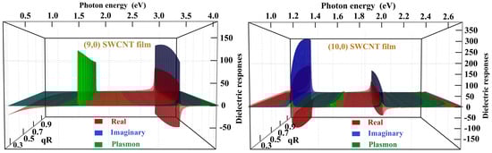 For , the right side of Equation (15) equals unity, implying that the dielectric response of the SWCNT array equals the host dielectric medium’s permittivity, which makes the dielectric response function isotropic. For the nonzero value of or , the component of the dielectric response is a complex function. The for two different composite films, one consisting of a periodic array of (9,0) SWCNTs and the other consisting of (10,0) SWCNTs, are presented in Figure 5. The SWCNT layers are embedded in a dielectric medium of thickness and relative permittivity , where R is the radius of the respective film’s SWCNT. The fractional volume of the CNT in both these composites is . The real part represents the exciton refraction spectrum, the imaginary represents the exciton absorption spectrum, and represents the plasmon response. The plasmon mode has a resonance at the point in which changes sign from negative to positive, and approaches zero. The plasmon response is positive for the entire energy range, indicating that energy loss is unavoidable. Even in the wide range of energy window (up to ∼4.0 eV), only one resonance is present for the (9,0) SWCNT film. However, one witnesses two resonances for the (10,0) SWCNT film for photon energy up to ∼2.6 eV. The plasmon resonance appears at a lower energy than the excitonic resonance for the (9,0) SWCNT film. The same is not true for the (10,0) SWCNT film. The plasmon spectrum is comparatively more pronounced in the (9,0) than in the (10,0) SWCNT film.