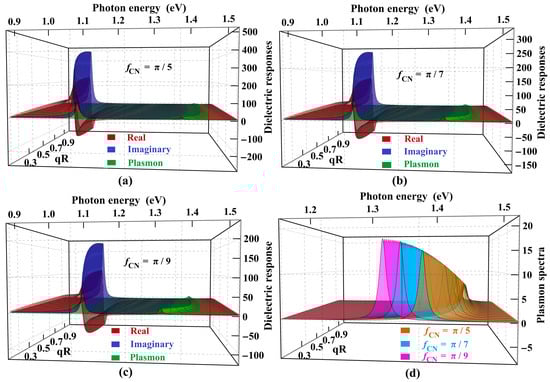 Dimensionless dielectric functions of a periodic array of (11,0) CNTs along the CNT axis as a function of momentum times radius of (11,0) CNT and the photon energy (expressed in eV). The relative permittivities of the substrate, superstrate, and dielectric medium are taken as 1, 1, and 15, respectively. Only the first resonances of the response functions are shown. Three different scenarios if the values, namely (a), (b), and (c), are taken. Figure (d) shows the comparison of plasmon spectra only for the cases chosen in (a–c).