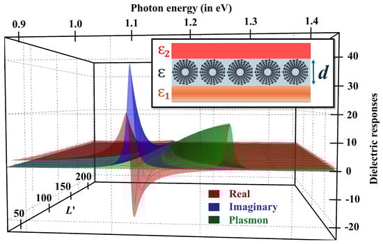 Substituting the expression of the volume of an isolated SWCNT and the composite volume, can be expressed as , which depends on the thickness of the film and SWCNT sparseness. Choosing a fixed value of , one can observe the effect of film thickness on the exciton–plasmon spectra, with varying values of . Note that is smaller for a larger value of d. Figure 6 shows a comparative study of dielectric responses for three different values of with fixed .