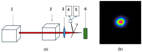 (a) Experimental setup: (1) fiber-coupled diode lasers, (2) scanning galvanometer, (3) focusing lens, (4) CCD camera, (5) power meter, (6) sample and platform, and (7) light-splitting sampling glass. (b) Focal spot of 1064 nm laser beams.