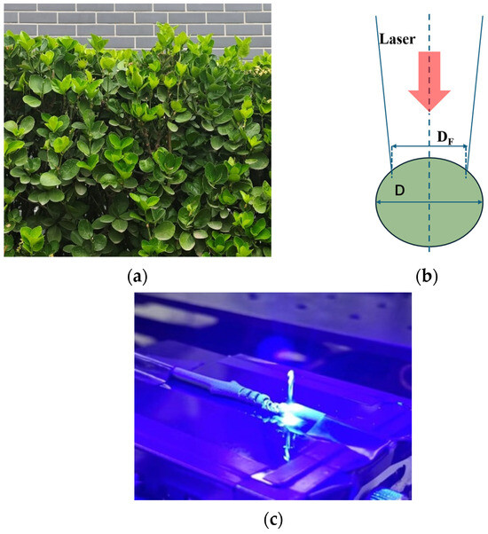 As shown in Figure 2a, the samples used in this experiment are from hedge branches (Magnoliopsida) collected from April to June. Hedge branches with a diameter of approximately 3–5 mm and a length of 8 cm, measured by a vernier caliper, are selected to ensure the consistency of the experimental samples. The samples are freshly cut from the living hedges about 0.5 h before the experiments. They are then fixed on a three-dimensional translation platform and a rotating table. The focusing lens is aligned to remain parallel to the rotating table.