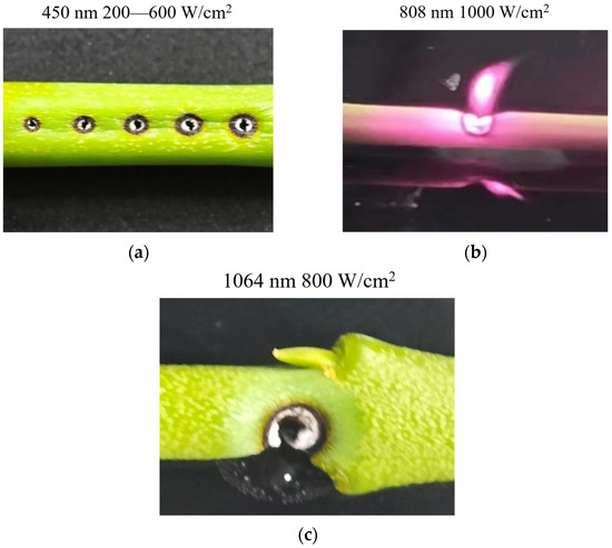During the interaction between the laser and the hedges, the ablation aperture increases with higher energy. This process is accompanied by the presence of flames and smoke and the evaporation of water droplets. For example, during the ablating of the hedge with a 450 nm laser, as the energy density increases from 200 W/cm2 to 600 W/cm2, the diameter of the ablation hole gradually enlarges, as shown in Figure 3a. Figure 3b depicts the irradiation of hedges with an 808 nm laser at a power density of 1000 W/cm2, causing the hedges to ignite. We observe water on the experimental platform beneath the branches, as shown in Figure 3c. This can be attributed to the strong absorption of laser energy by water molecules within the plant tissue, which leads to intense heating and the explosive boiling of the stem tissue.
