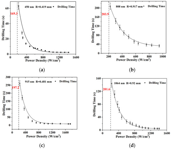 Variation in drilling phenomenon as a function of laser power density: (a) 450 nm, (b) 808 nm, (c) 915 nm, and (d) 1064 nm.