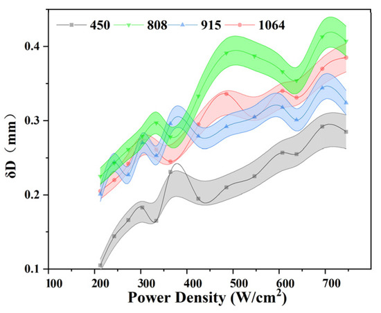 The difference (δD) between the diameter of the drilling hole and the laser focus as a function of the laser power density is shown in Figure 5. δD is the difference between the diameter of the drilling hole and the laser spot, which is affected by the laser power density and sample material used in the experiment. Its formula is δD = D (drilling hole diameter)-D (laser focus diameter). With the increase in laser power density, δD increases. When the energy is the same, δD produced by 808 nm laser pulses is the largest and that of 450 nm laser pulses is the smallest. δD can be considered an indication of the efficiency of the sample in utilizing the laser energy. A larger δD suggests a more extensive thermal diffusion. The laser with a wavelength of 450 nm demonstrate superior performance compared to others. This is because they produce the smallest δD, implying a more focused and efficient conversion of laser energy into the cutting process, thereby resulting in minimum energy wastage.