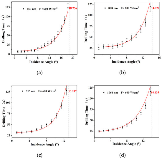 The relationship between the drilling-through time and the laser incidence angle: (a) 450 nm, (b) 808 nm, (c) 915 nm, and (d) 1064 nm.