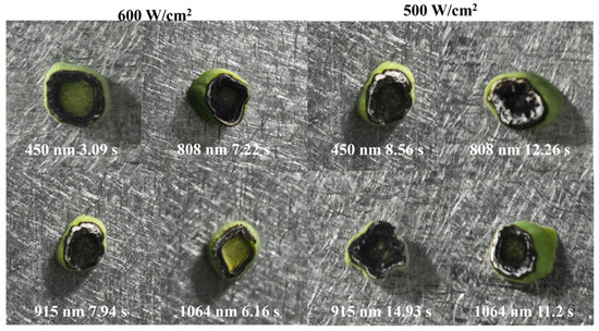 To minimize the impact of varying spot diameters and laser power on the experimental results, these factors are standardized. A laser spot diameter of 1.83 mm is selected. This ensures a more even distribution of the laser across the branch surface, allowing for the efficient use of the laser energy while minimizing the effects of local power density fluctuations. Furthermore, the spot size is optimally chosen to prevent excessive energy dispersion. Due to the output of the four lasers, a laser power density of 600 W/cm2 is set. As shown in Figure 7, the results are consistent with previous findings. The drilling time with 450 nm laser pulses is the shortest, at 5.23 s, while the diameter of the hole is also the smallest, measuring 1.942 mm. The drilling times for 808 nm, 915 nm, and 1064 nm lasers all exceed 30 s. The 450 nm laser shows an advantage in drilling efficiency, demonstrating its potential applications for cutting precision and efficiency.