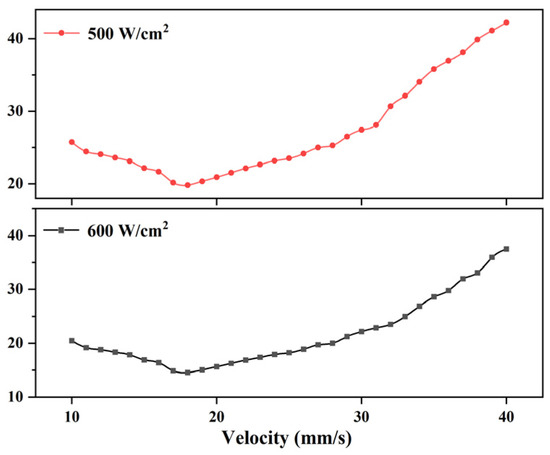 Laser cutting time as a function of the scanning speed with laser power densities of 500 W/cm2 and 600 W/cm2.