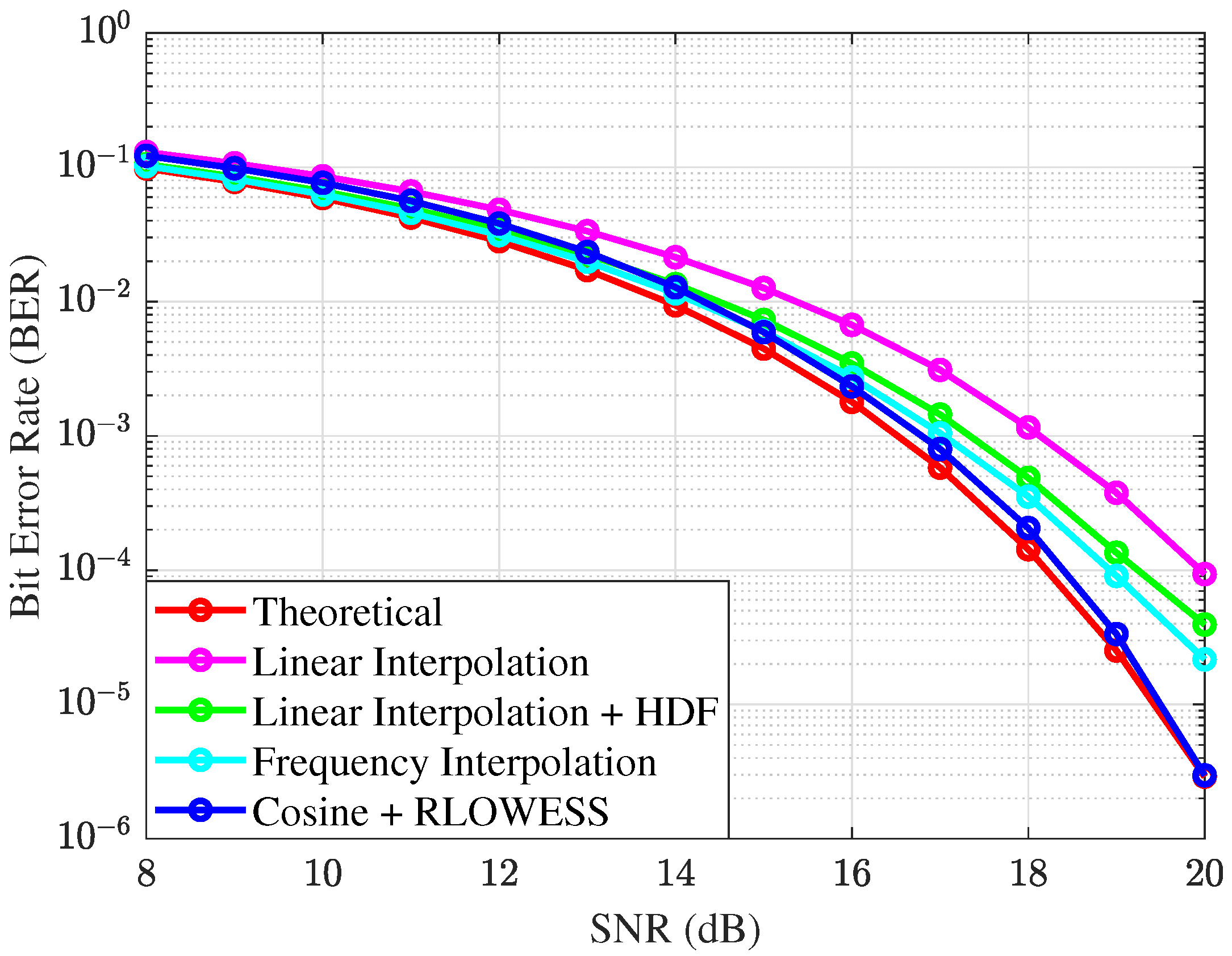 Since n is typically a slot of N, the computational cost of Cosine-RLOWESS is slightly higher than that of AKF, especially as the number of pilot symbols increases. However, for small values of n, its complexity remains close to , making Cosine-RLOWESS a computationally viable alternative.