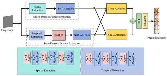 The grayscale images obtained from preprocessing are fed into the two convolution layers (Conv) and max-pooling layer (MaxPool) of the CNN to extract low-level features and perform dimensionality reduction. The outputs are then sent to the spatial feature extraction module and the temporal feature extraction module for feature extraction in the spatial and temporal dimensions. Subsequently, their outputs pass through the spatiotemporal cross-attention module and the temporal–spatial cross-attention module. The output features are concatenated and fused through a fully connected layer, with the final classification result determined by the function, which selects the category corresponding to the maximum component.