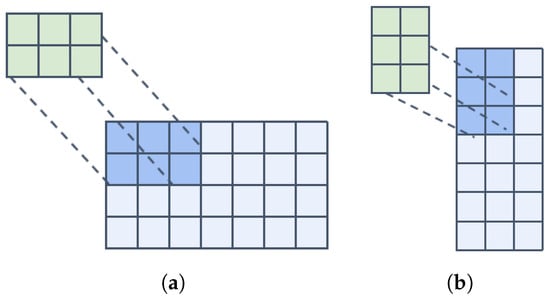 Asymmetric convolution operations for feature extraction: (a) Enhances spatial feature detection to optimize shape and boundary recognition. (b) Extracts temporal features to analyze patterns and movements over time. The green indicates convolution kernels, and the light blue shows the feature maps to be convolved.
