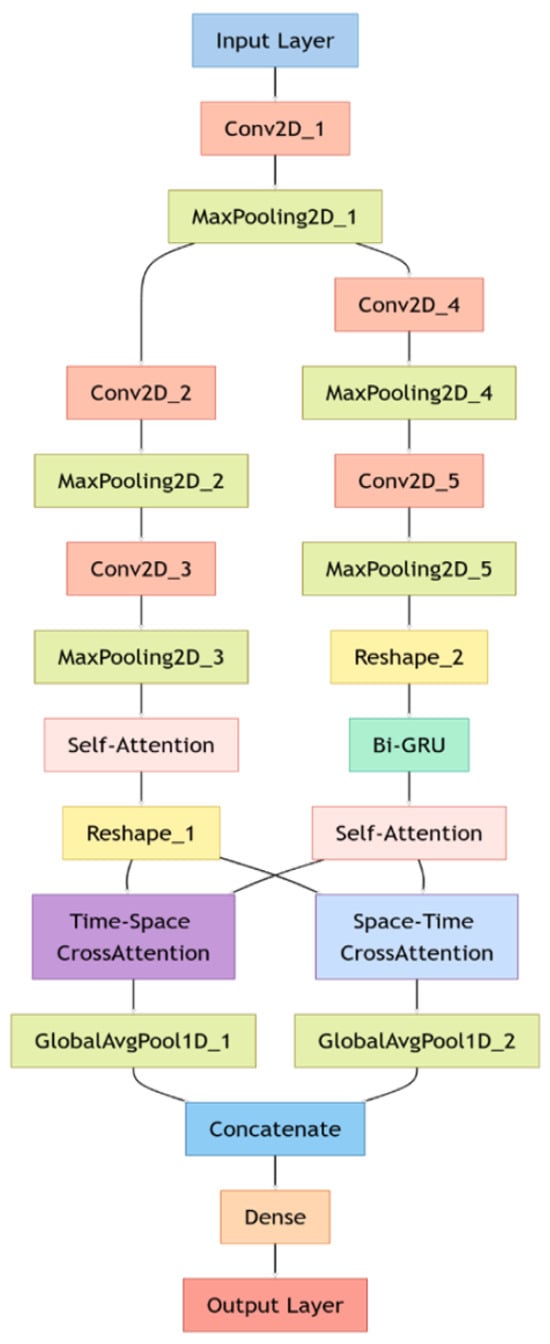 After the initial feature extraction, the model continues to reduce the spatial dimensions through a pooling operation (1, 2). This phase of pooling not only helps downsample the data but also further enhances the model’s performance in learning time-series features. Finally, the data are divided along the vertical direction into multiple time segments, each corresponding to the signal variations at different moments, providing a more accurate time-series representation for subsequent temporal analysis. The resulting temporal sequence is then input into the BiGRU, capturing the time dependencies within the sequence. The bidirectional structure of BiGRU strengthens the model’s ability to capture long-term dependencies, enabling the network to fully understand the temporal dynamics of the sequence. Additionally, the self-attention mechanism is introduced to optimize the BiGRU output, enhancing its ability to represent temporal features. By combining BiGRU with the self-attention mechanism, the module can capture both local features and global contextual information, improving its understanding and processing capabilities for time-series data.